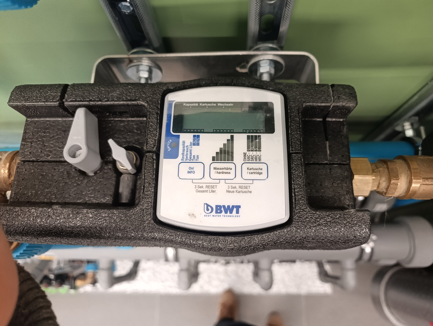 Il sistema è dotato di contatore con display elettronico per il monitoraggio continuo dei volumi di acqua di riempimento e reintegro. L’elettronica integrata calcola l’esaurimento della cartuccia in base alla durezza dell’acqua e ai volumi trattati, segnalando la necessità di sostituzione.